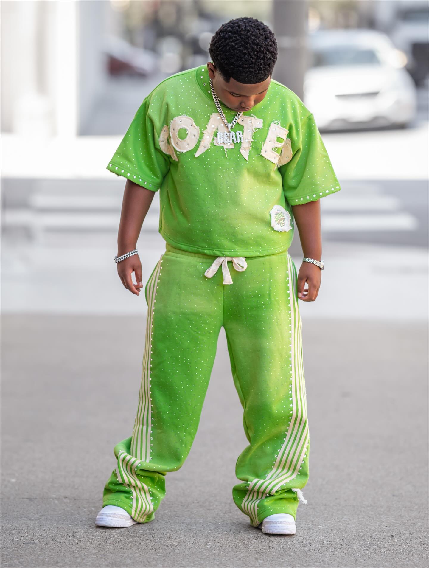 Customized appliqué patch embroidered two-piece children's tracksuit, 100% cotton, double waist striped sweatpants, 2025