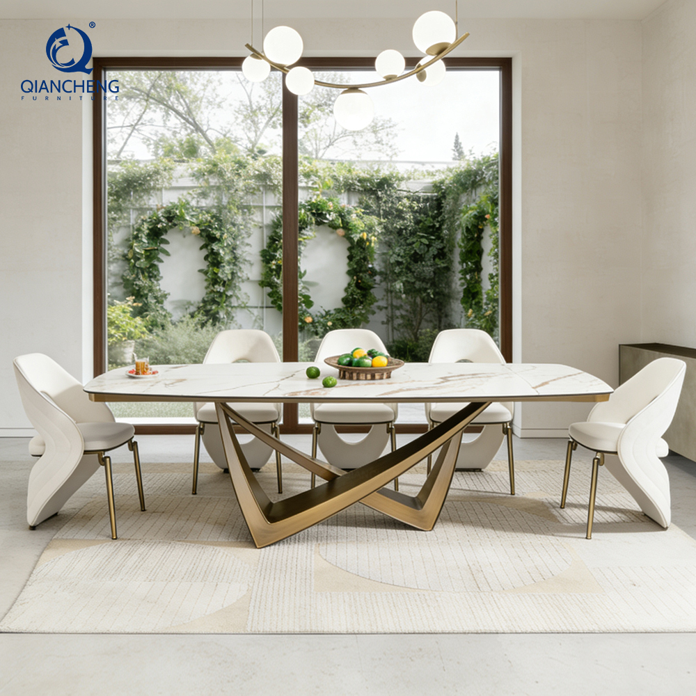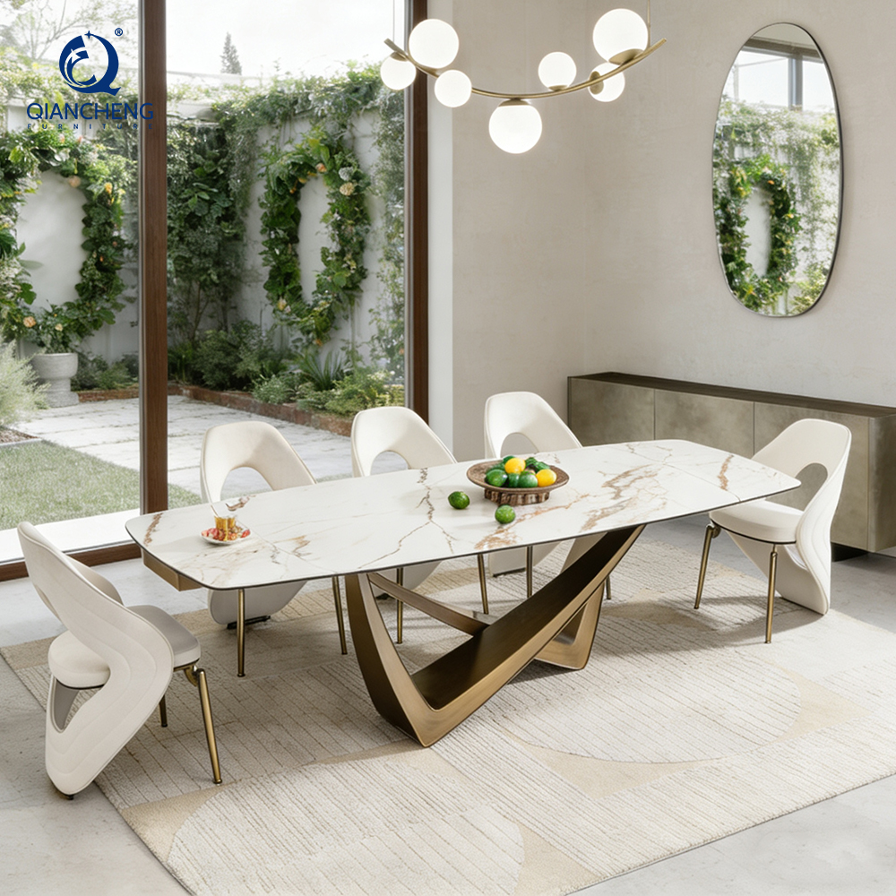Hot selling dining table with 8 chairs, 12mm ceramic marble tabletop, cheaper modern home furniture, expandable dining table set