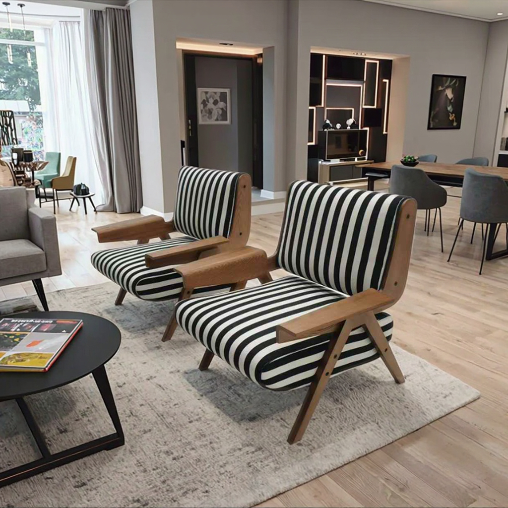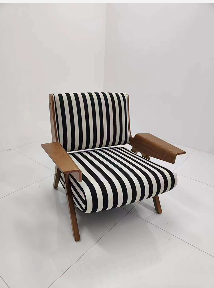 Modern striped cushioned sofa chair with wooden frame and armrests, providing stylish comfort for living rooms, offices, and hotels
